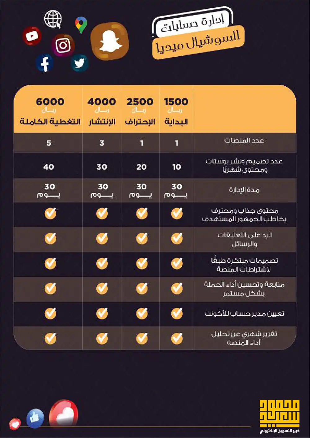يقوم محمود سعيد إدارة حسابات السوشيال ميديا (فيسبوك، تويتر، انستجرام، سناب شات، يوتيوب، لينكد ان )
